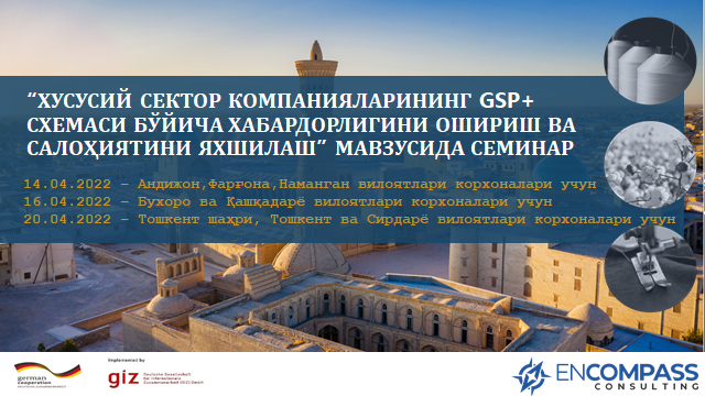 Encompass Consulting организовала и провела серию семинаров в различных регионах Узбекистана, направленных на повышение осведомленности и укрепление потенциала компаний частного сектора в отношении экспортных возможностей на рынок ЕС, предоставляемых тарифными преференциями GSP+ и обязательствами, вытекающими из международных конвенций, которые являются обязательное условие для сохранения статуса GSP+. GSP Европейского союза (Общая схема преференций) отменяет ввозные пошлины […]